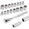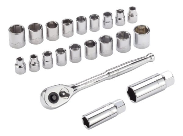 Haz el trabajo bien con el Mastercraft 20-piece Drive Socket Set. Este conjunto cuenta con una variedad de enchufes SAE poco profundos y profundos en tamaños de accionamiento de 1/2 en, incluyendo 18 tomas marcadas con hendiduras cuadradas para una fácil identificación. Los tamaños SAE incluyen 3/8, 7/16, 1/2, 9/16, 5/8, 11/16, 3/4, 13/16, y 7/8-in, mientras que los tamaños métricos varían de 10 a 18mm. El conjunto también incluye una barra de trinquete y extensión. El acabado cromo pulido de esta estructura de herramientas garantiza una durabilidad y resistencia a la roce para un uso duradero.