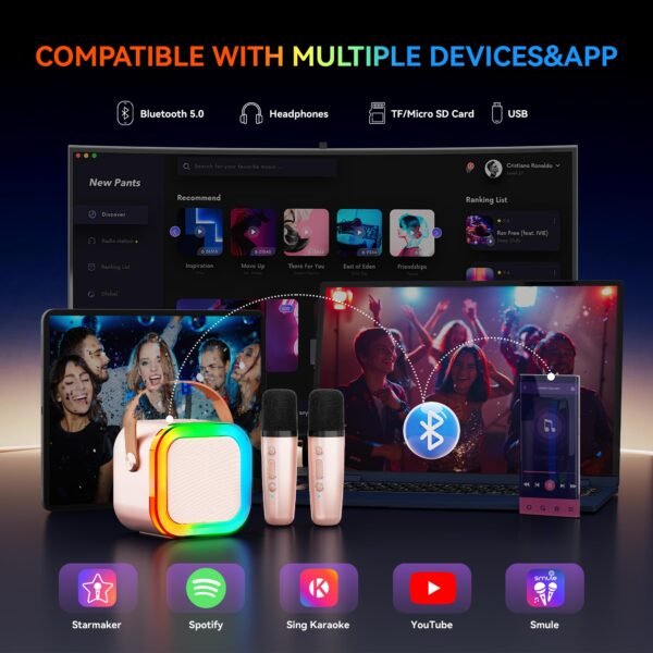 - 【BLUETOOTH 5.0 TWS TECHNOLOGY】: This bluetooth karaoke speaker for kids and adults with 2 microphones that automatically connect to each other, adopts new bluetooth 5.0 technology ensures instant pairing, providing stable transmission and 50ft long-distance without obstacles.this karaoke machine supports TF card, USB, and AUX input connections and is compatible with Android devices, TVs, iPads, tablets,car karaoke,and PCs.