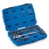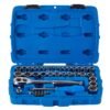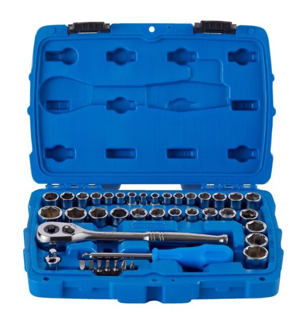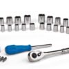 Los accesorios de 1/4″-conducción incluyen 16 enchufes estándar de 6-pt, 1 mango de spinner que también se puede utilizar como barra de extensión, y portazón de 1 bit