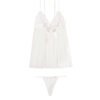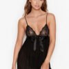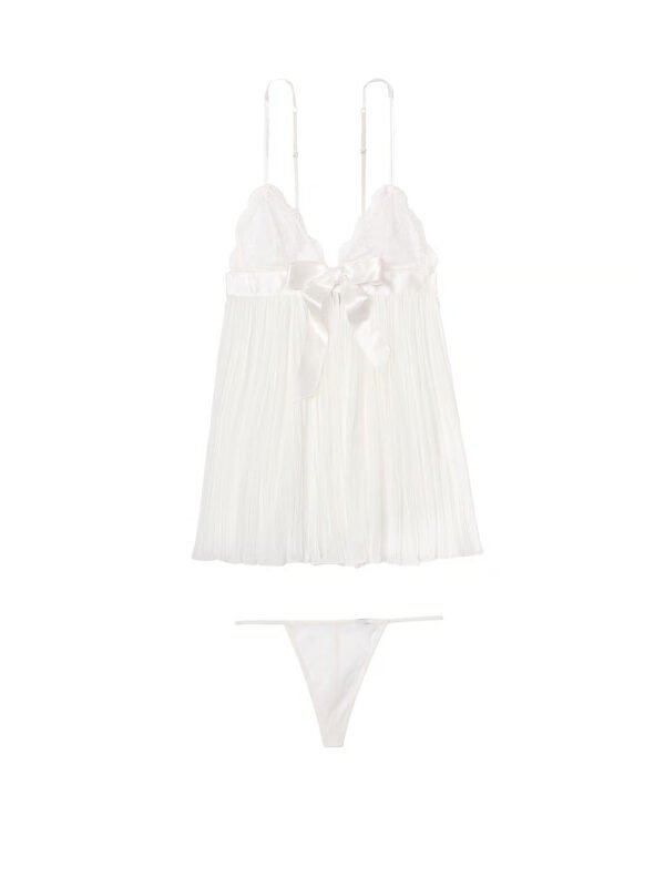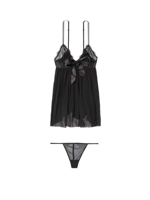 This sweet set is infused with vintage glamour. Unlined lace cups are secured with a shining satin bow while the pleated chiffon bodice billows with your every move.